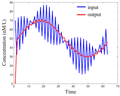 Simulations of DNA implementation of a moving-average FIR filter. This filter removes the high-frequency component from an input signal, producing an output signal consisting of only the low-frequency component. Here the "signals" are molecular concentrations.
