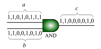 Multiplication with an AND gate. Here the variables represents the probabilities of obtaining a 1 versus a 0 in stochastic bit streams. The AND gate produces an output probability that is the product of the of the input probabilities and .
