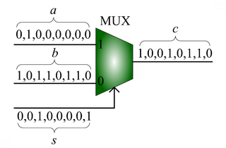 Scaled addition with a multiplexer (MUX). Given input probabilities , and , the MUX produces an output probability .