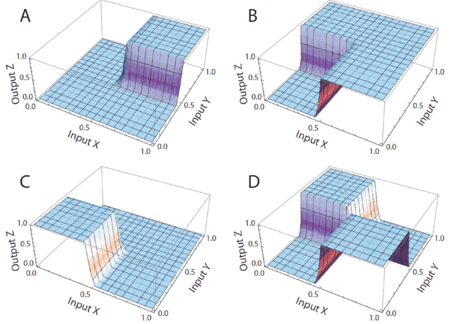 Simulations of DNA implementation of logic gates. The input signals are molecular concentrations X and Y; the output signal is a molecular concentration Z. (A) AND gate. (B) OR gate. (C) NOR gate. (D) XOR gate.