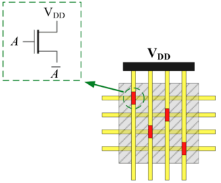 A nanowire crossbar switch. The connections between horizontal and vertical wires are FET-like junctions. When high or low voltages are applied to input nanowires, the FET-like junctions that cross these develop a high or low impedance, respectively.