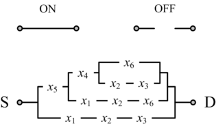 Shannon's model: two-terminal switches. Each switch is either ON (closed) or OFF (open). A Boolean function is implemented in terms of connectivity across a network of switches, between the source S and the drain D.