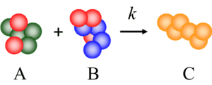 Molecular reactions define rules according to which reactants form products. Here molecules of type A combine with molecules of type B to form molecules of type C, at a rate proportional to the molecular concentrations of A and B as well as a rate constant k.
