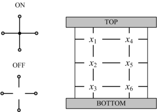 Our model: four-terminal switches. Each switch is either mutually connected to its neighbors (ON) or disconnected (OFF). A Boolean function is implemented in terms of connectivity between the top and bottom plates. This network implements the same function as the two-terminal network on the left.